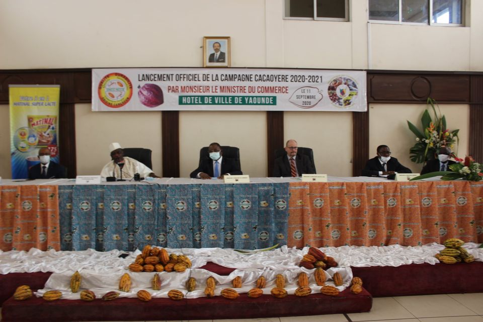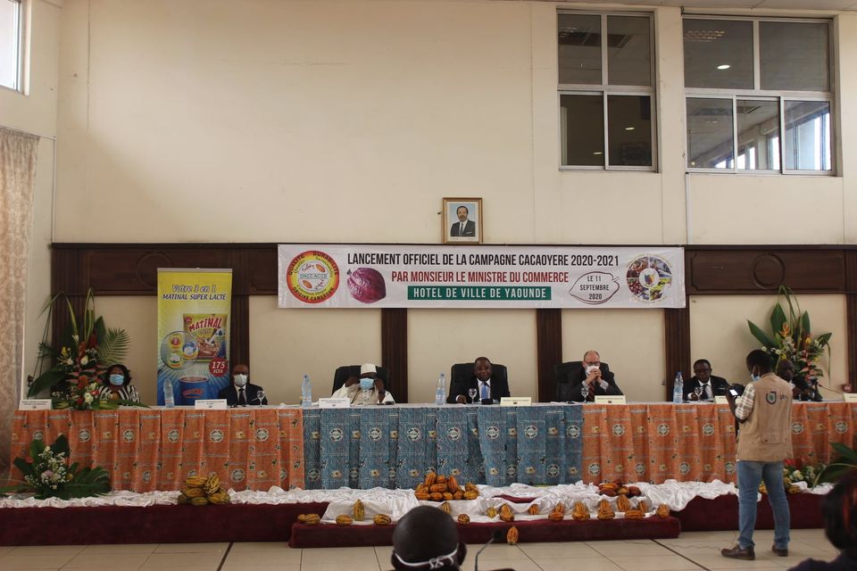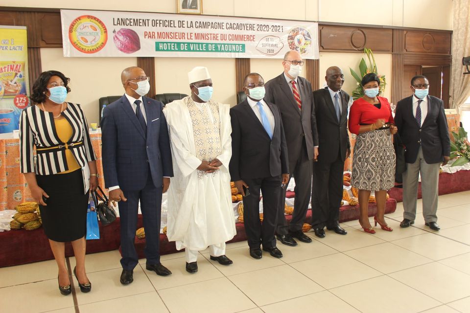 Le Ministre du Commerce, Luc Magloire MBARGA ATANGANA a présidé le point de presse marquant le lancement officiel de la campagne cacaoyère 2020-2021 à l’hôtel de ville de Yaoundé ce 11 septembre 2020. Il était accompagné de son collègue Gabriel MBAIROBE de l’Agriculture et du Développement durable, de Michel ARRION, Directeur Exécutif de l’Organisation Internationale du Cacao (ICCO), de l’autorité administrative de la Région du Centre ainsi que des présidents du Conseil Interprofessionnel du Cacao et du Café (CICC) et de l’Office National du Cacao et du Café (ONCC).